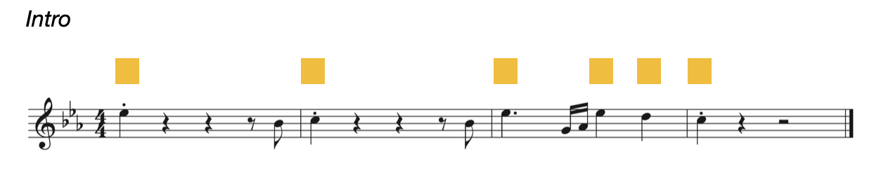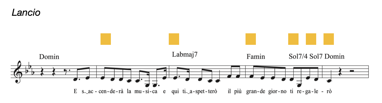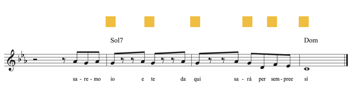 Nella nostra canzone compare più volte una variante “espansa” della scansione incitativa individuata da Stefani, con un battito in più. Compare subito, con la parte degli archi nell’Introduzione: