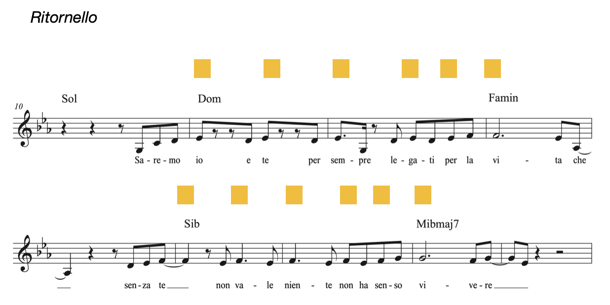 All’interno del Ritornello il modulo ritmico-metrico compare due volte, all’inizio e alla fine: