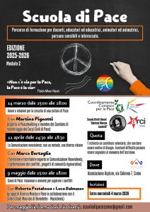 La Scuola di Pace, giunta al terzo anno di attività, opera nella convinzione che parlare di pace non sia sufficiente per educare alla pace e che sia essenziale l’acquisizione di modalità nonviolente da applicare quotidianamente nelle relazioni interpersonali.